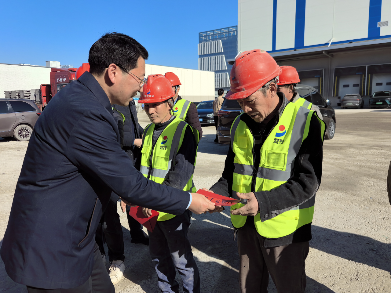 慰问组一行首先抵达长三角国际农批中心项目现场,看望慰问在寒风中坚守岗位的一线施工人员。孙耀铜详细询问工程进展和职工生活保障情况,对大家在重点项目建设中的辛勤付出表示衷心感谢,并叮嘱大家注意防寒保暖、确保施工安全。