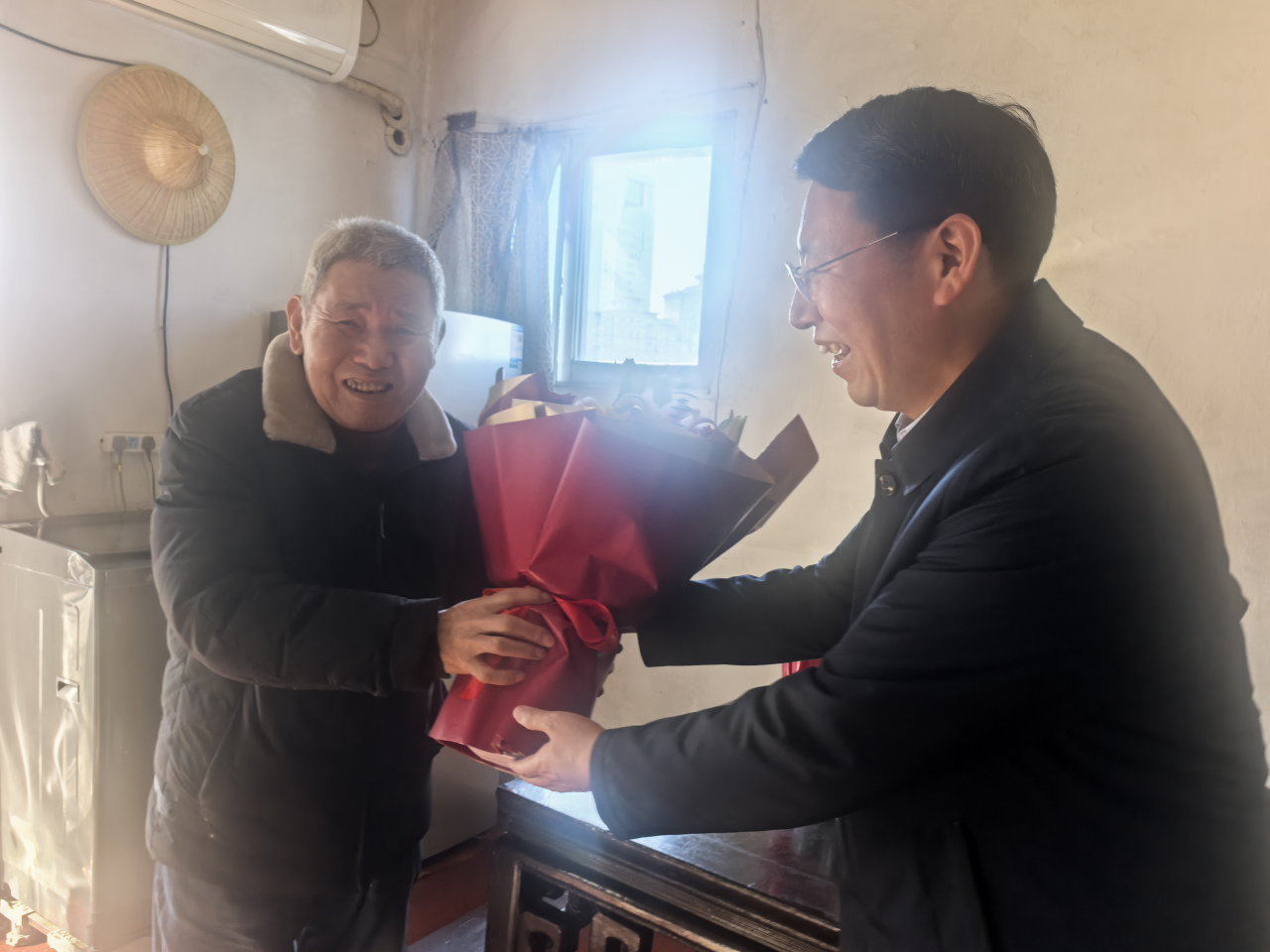 在省级劳动模范章九斤家中,孙耀铜与老劳模畅谈,感谢他为经济社会发展作出的贡献,并仔细询问其身体状况与生活所需,嘱咐随行工会干部要常态化做好劳模关怀工作。